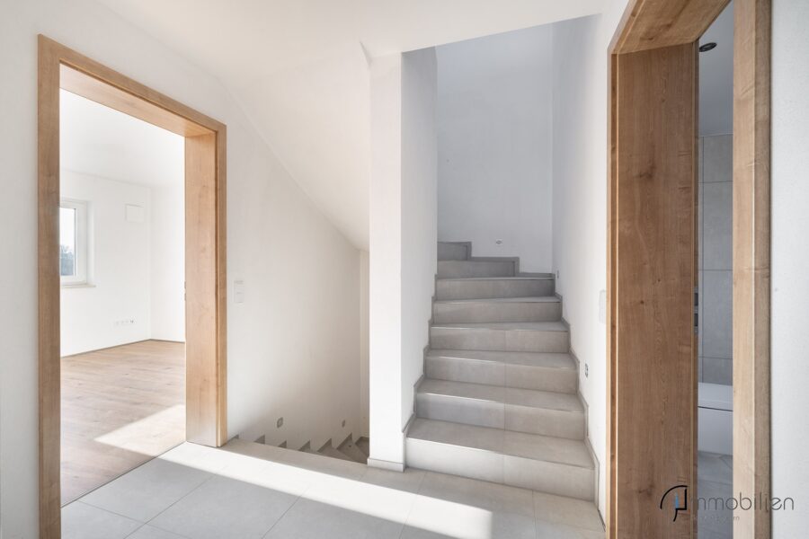 Über die Treppe die mit Treppenstufenbeleuchtung ausgestattet ist, gelangt man in das Obergeschoss. Hier befindet sich das großzügige Elternschlafzimmer sowie zwei schöne helle Zimmer. Das moderne Tageslichtbad mit bodengleicher Dusche und einer halb freistehenden Badewanne lädt zum entspannen ein und bietet ausreichend Platz für die ganze Familie.